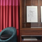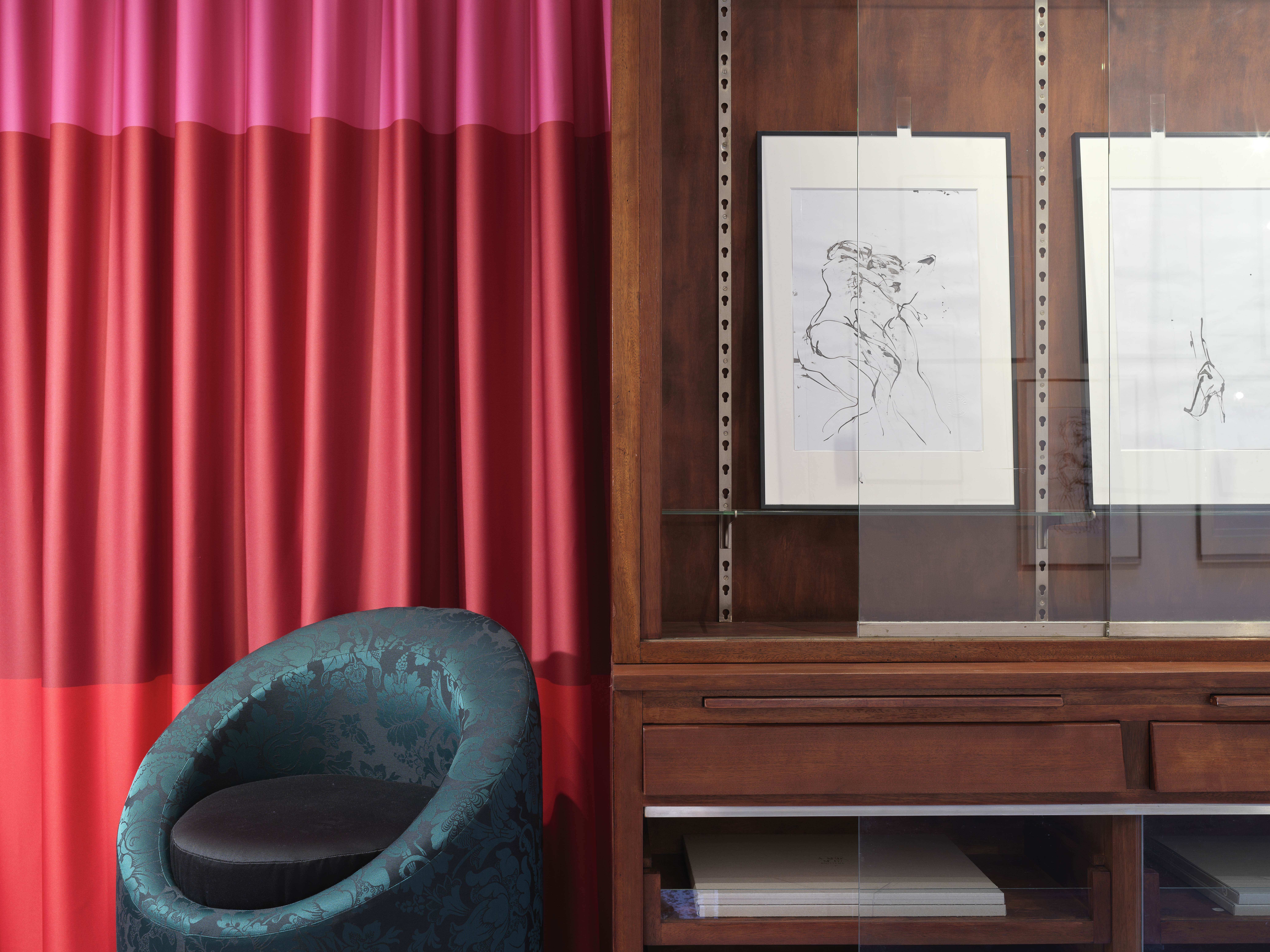 The fabric covering the walls, specially developed by Métaphores in a harmony of pink, red and orange, draws us into an inviting haute-couture salon with a pop feel. A wide-width printed tricolour satin was selected to bypass manufacturing constraints and ensure a perfect look and fall.